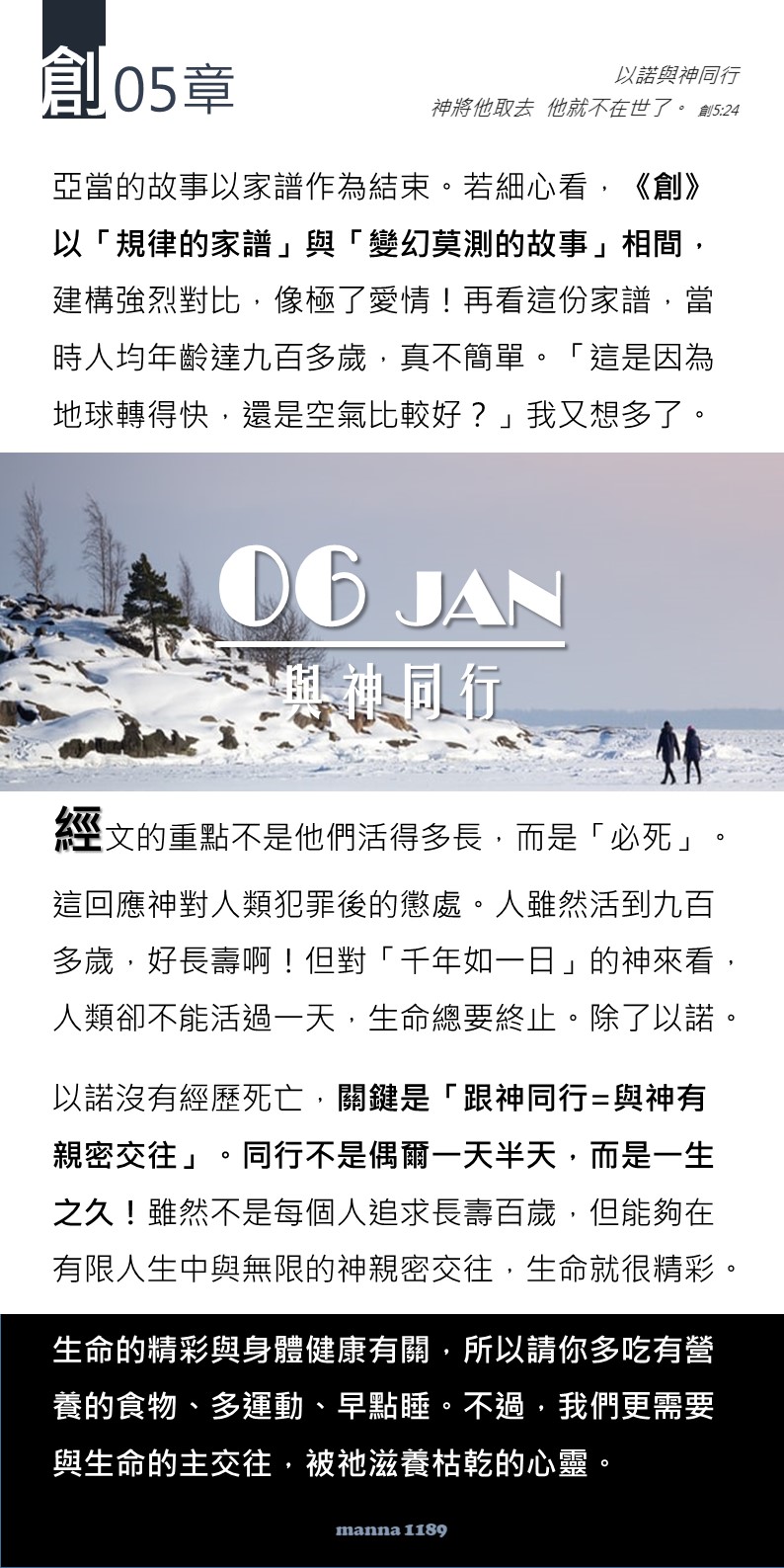 今天嗎哪文章提到關鍵我們要像以諾, 「 跟神同行=與神有親密交往」。 同行不是偶爾一天,而是一生之久!