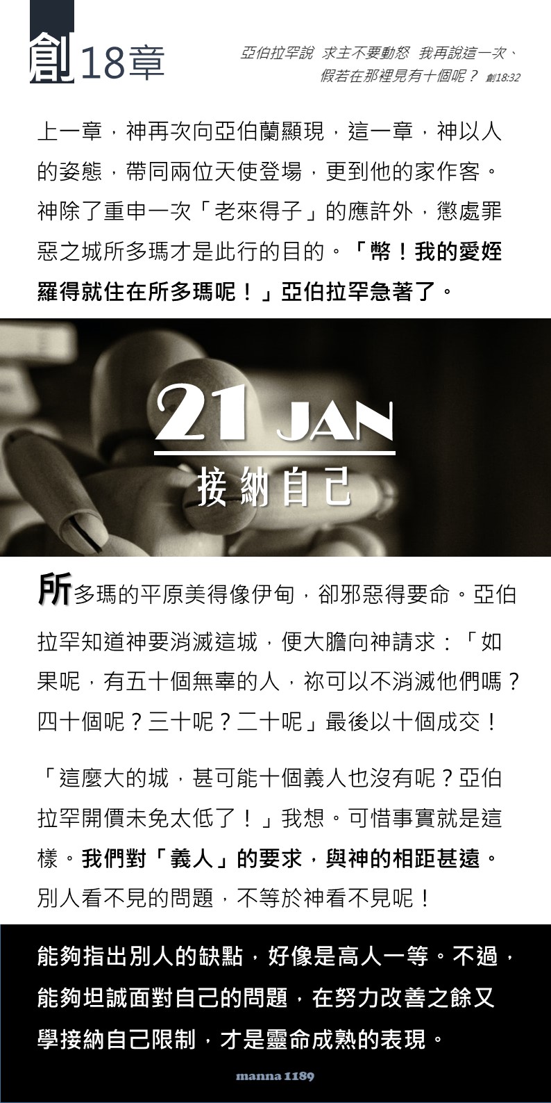 🤓今天嗎哪文章說的都提醒我:所多瑪美得像伊甸園,裡面卻邪惡的要命,亞伯拉罕也是很無奈,因 神給出結果是一個義人也沒有。接納自己的限制令我有些困擾,因為我以為已經好接納自己(的各種限制)🤔。