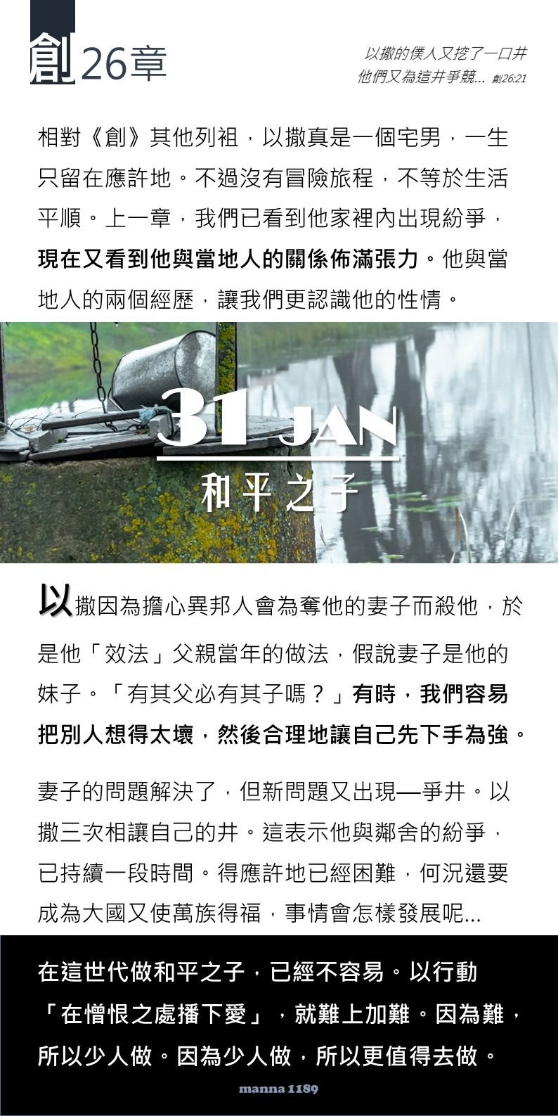 好願意去實踐「愛」,以撒示範了與人相處的關鍵是不與人爭競,願循著這足跡走上,活出主的道。