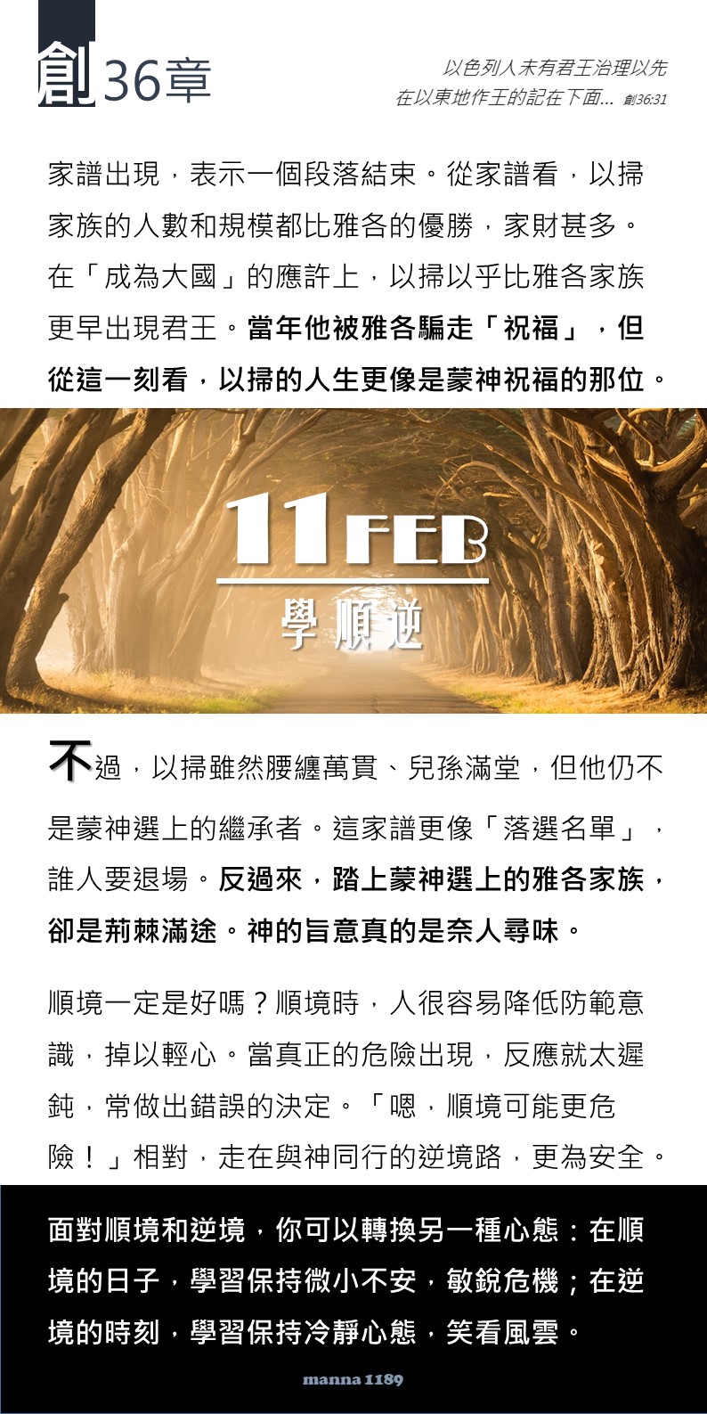🤓創36列出以掃3代14個族長和原住民西珥3代7個族長, 神賜福以掃和他的後代昌盛,比原住的居民強盛一倍,又將以東7個王列出來,但7個王的名字都不在和以掃後代的名字相同,也沒有說明是以掃的後代,似是不同的宗族興起作以東王,但以掃家族仍然強盛。