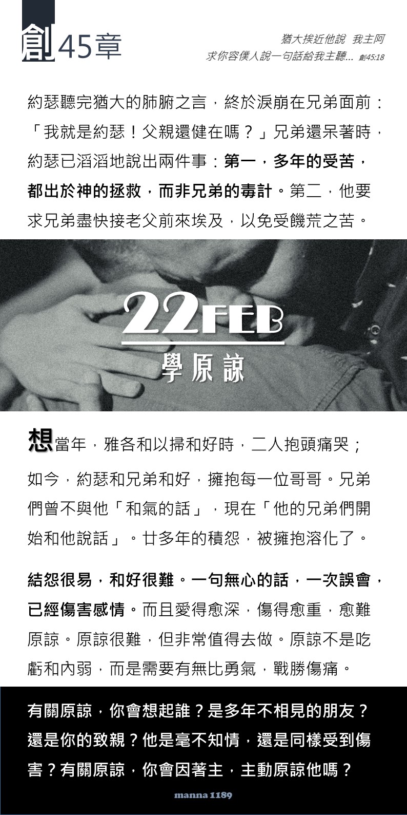 🤓約瑟為什麼要在這些哥哥來到才領會這是神旨意呢?差我來到這裡,不是你們,乃是 神。我回想很多年來我生命中發生過的轉捩點,如果當時我有讀過這段聖經,我能憑信心告訴自己,差我行到這一步的, 乃是 神,我或許會再堅持下去,我相信我會有不同的決定。我不敢再想太深,我怕自己因此墮入悔恨不能離開。再努力吧,前面還有要行的路,望前頭的路走去,前面還有些要經歷 主的。