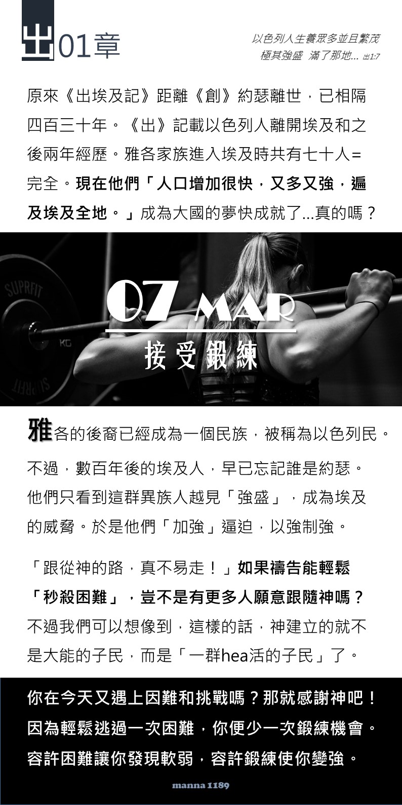 開始讀出埃及記時,評估一下自己的屬靈情況樂意跟從 神,例如遇到試探,內心有良善的力量抗衡。看出埃及記,裡面很多動詞是很有方向性的,又留意到鋪排上因為是出埃及,所以文章導向也偏向帶出「出」的原因。將一件事的大局脈絡仔細鋪陳出來,而整件事都由 神帶領,真是精彩。