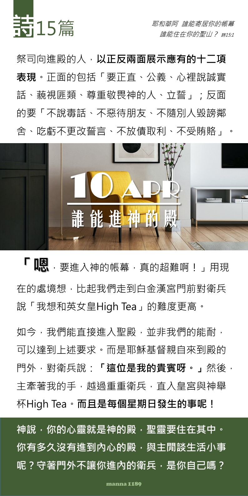 能住在 神的聖幕裡,只有能做到行為正直,行事公義,說誠實話,能控制把口不說誹謗人和鄰里的話,善待朋友,不以惡人為伍,他心敬畏 神,也尊重同樣敬畏 神的人,他對誓言尊重不計付出遵守,還不放債取利,不受賄賂害無辜的人,嘩!我心充滿力量,能行這些事的人確實是見到 神,才能內心如此貴重, 神必與這人同在,喜悅這人,使他不被動搖。