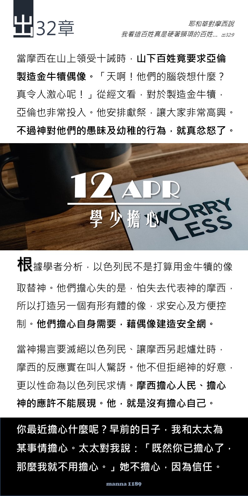 嗎哪說擔心,我最近也忽然為前途擔心起來,但剛好嗎哪教導提醒我以摩西所遇為信心,不擔心,我也不擔心了,因為信任 神。