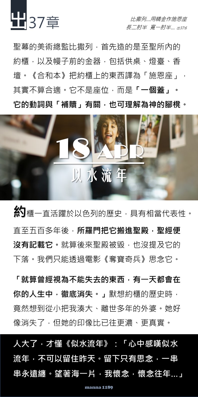 嗎哪說的一段很感觸,「就算曾經視為不能失去的東西,有一天都會在你的人生中,徹底消失。」默想約櫃的歷史時,…約櫃在大衛或以前時代是何等重要重要,但 神要其隱藏時,便隱藏了。