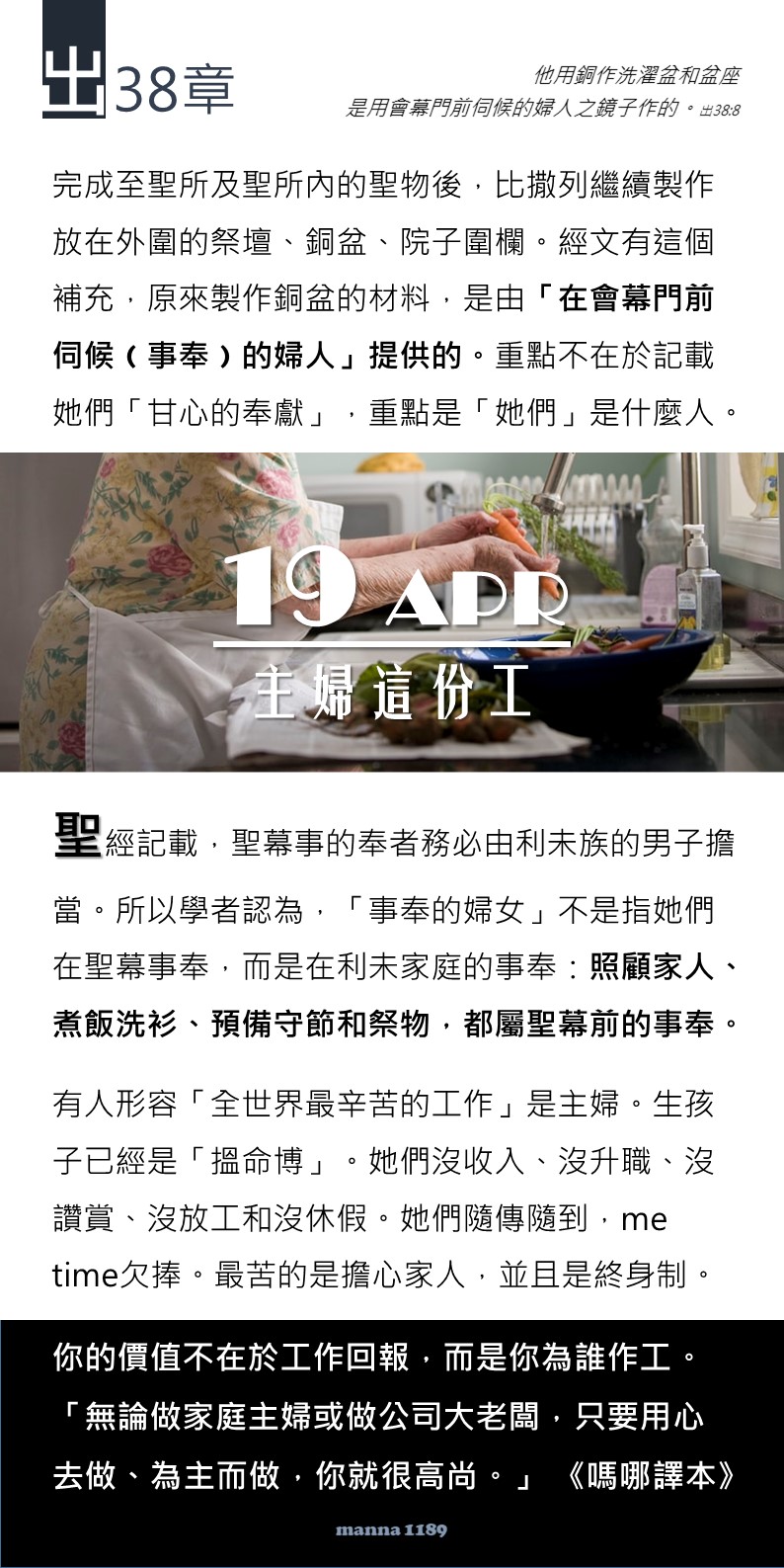 嗎哪提醒十分重要:你的價值不在於工作回報,而是你為誰作工。「無論做家庭主婦或做公司大老闆,只要用心去做、為主而做,你就很高尚。」
