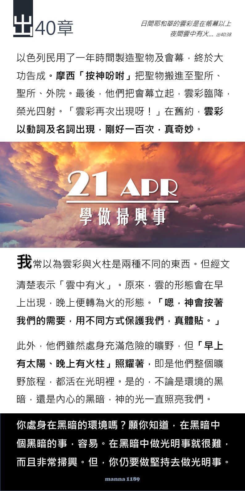 很喜歡嗎哪所描述以色列人整個曠野旅程都在光明中行走,因 神的同在,日間有雲柱太陽,夜間有火柱。這段出埃及的日子,有黑暗出現是常態,但 神總會將光照在我生命裡頭,這段出埃及的日子都在 神的光中行過了, 神在這裡,邁向利未記去。