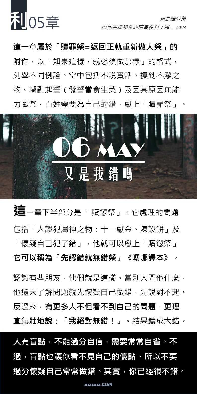 看嗎哪文章,才明白下半部其實是講懷疑自己做錯有罪,先獻祭認錯。回到現實,我想今天 神若要繼續執行獻祭,我想我很快便破產了,現今良種牛一頭要$8400人民幣(1200斤重),問心講,我天天也犯下不同的錯,若全算為罪,一個月的贖罪祭已用上$252,000.00!罪的工價乃是死,願靠 神的恩好好的跟從 主耶穌, 神若追討,我真的擔當不起啊!