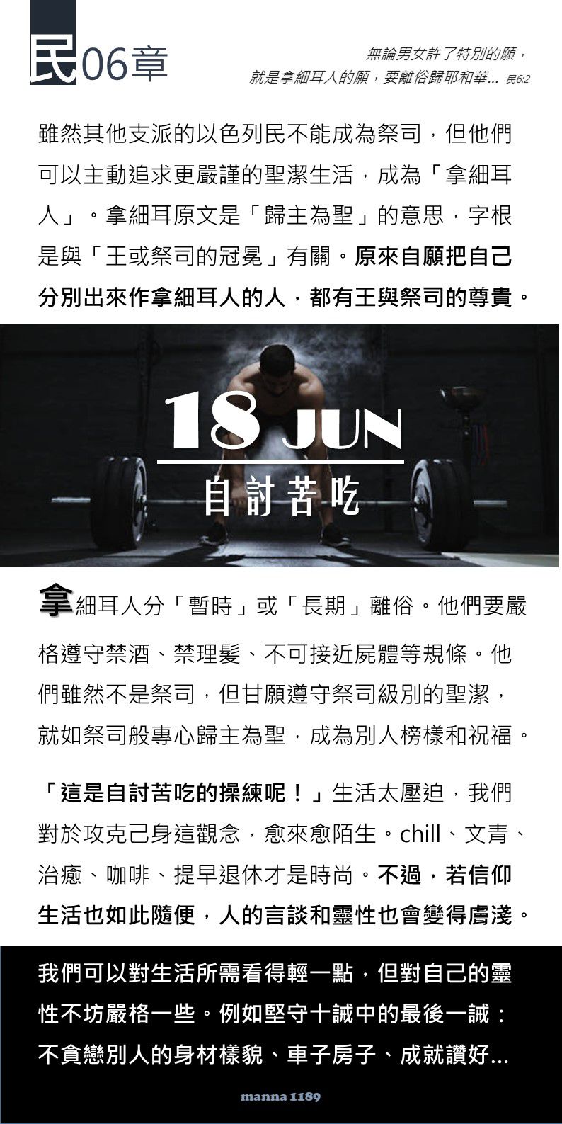 嗎哪文章提到拿細耳人如此專心聖潔,能成為別人榜樣和祝福。我想是的,盡心持守聖潔,美得不得了。不約而同跟嗎哪看法相似,早覺得人言談和靈性慢慢變得膚淺,但會對自己更嚴格,我心不安,自己太差。近來常記著「認識耶和華,便是智慧的開端。」願更親近 神,使自己更有智慧作事,能更快做妥各樣後,爭取更多時間服侍 主。