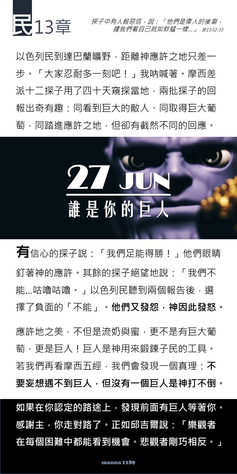 迦勒在摩西面前安撫百姓,說:「我們立刻上去得那地吧!我們足能得勝。」 (民數記 13:30 新標和合本)