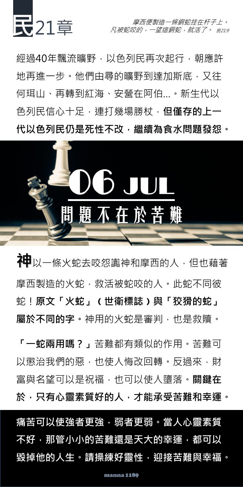 照註釋解,這批以色列人是第二代,可能被以東人阻撓需要繞路行,以至心情煩躁更發怨言,將 神的恩典賜的食物(嗎哪)當作無用,將天天預定降下的恩典形容為淡薄,眼前的厭惡伸延至敬畏 神的心也消滅了,以至 神的憤怒臨到,40年來的漂流(操練)是白費了,迎來死亡,像極我的日常,求主赦免我的罪。