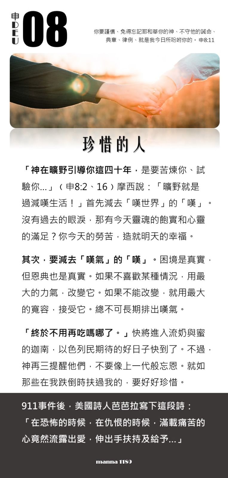看嗎哪今天的圖畫,是手拖手同行,手指帶上介指,帶著這份雙廝守的約同行前面的路。走前面的路要有喜樂,見証這約,嗎哪提出的減嘆生活很好的,嘆世界的心降低戰力,嘆氣的生命增加多餘的苦惱和怨氣,忘記造物主的恩典。反之,要在仇恨播種愛,伸手扶持給予。